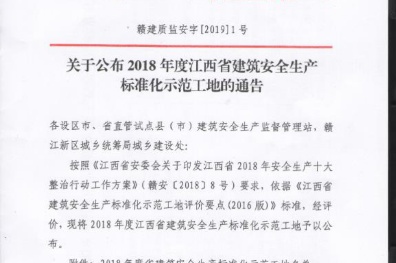 2018年全年安全創(chuàng)優(yōu)工作取得了顯著成績,江西省建筑工程安全質(zhì)量監(jiān)督管理局發(fā)布公告,我司承建的南水.中央公園(一期)項目被評為“2018年度江西省建筑安全生產(chǎn)標準化示范工地