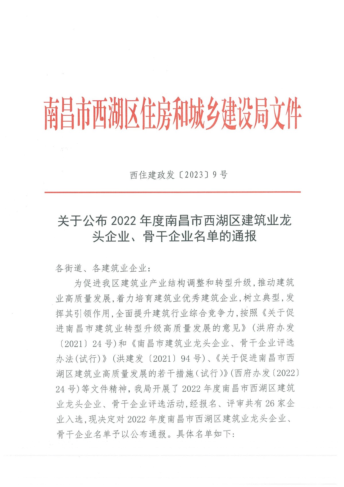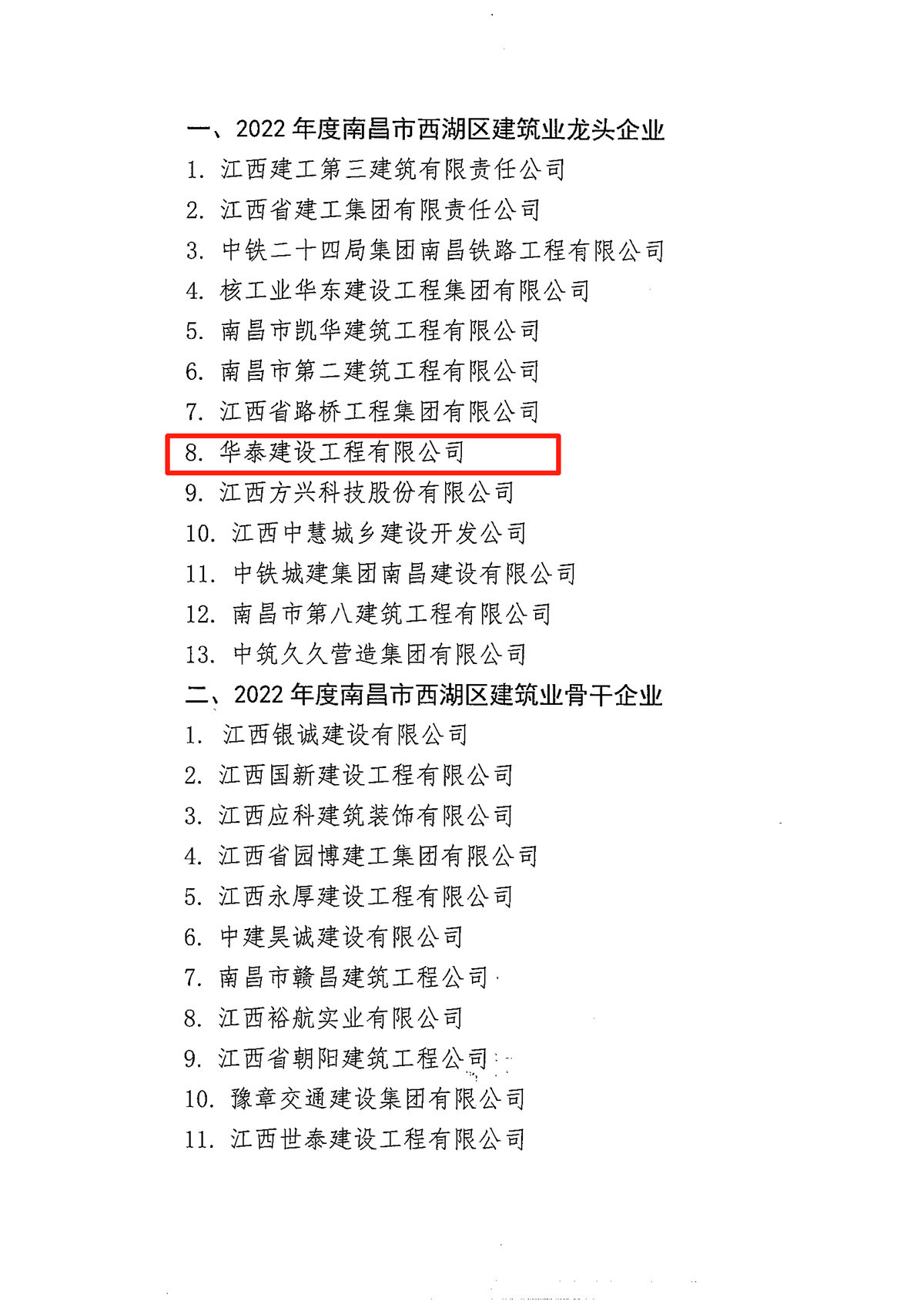 2023年2月21日,恰逢農(nóng)歷二月二龍?zhí)ь^,在這個紅紅火火的日子,南昌市西湖區(qū)住房和城鄉(xiāng)建設(shè)局發(fā)布了《關(guān)于公布2022年度南昌市西湖區(qū)建筑業(yè)龍頭企業(yè)、骨干企業(yè)名單的通報》,經(jīng)層層嚴格考評認定,華泰建設(shè)工程有限公司憑借實干篤行與卓越品質(zhì)獲得“2022年度南昌市西湖區(qū)建筑業(yè)龍頭企業(yè)”榮譽稱號!這是繼2023年1月獲得“2022年度南昌市建筑業(yè)骨干企業(yè)”后的又一個榮譽認證。這不僅是對華泰建設(shè)的嘉獎與再次肯定,更是對華泰建設(shè)發(fā)展的激勵與鞭策。