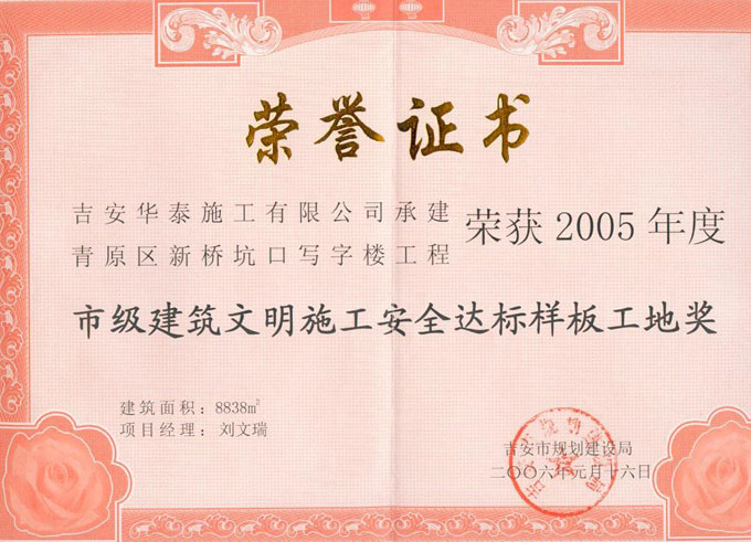 首頁(yè) > 關(guān)于華泰 > 企業(yè)榮譽(yù) > 青原區(qū)坑口寫字樓榮獲市級(jí)安全達(dá)標(biāo)樣板工地獎(jiǎng)