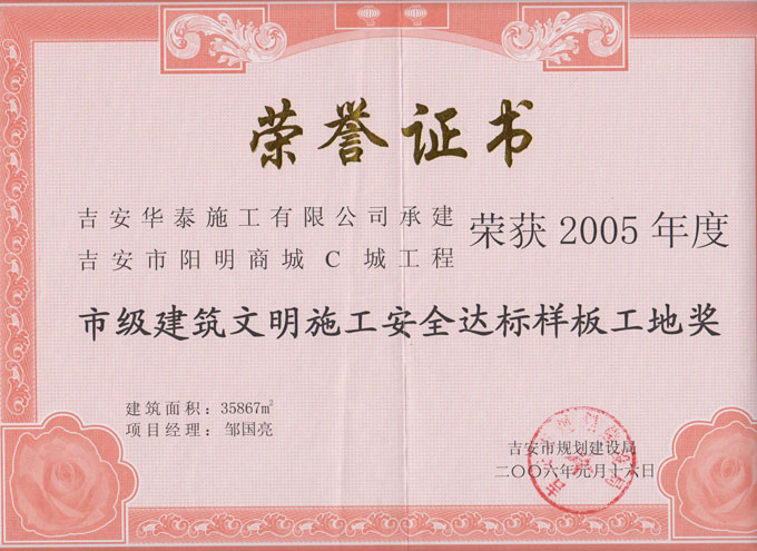 吉安陽明商城C城工程榮獲市級建筑文明樣板工地獎