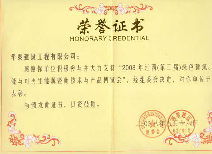 榮獲2008年綠色建筑博覽會(huì)榮譽(yù)證書(shū)