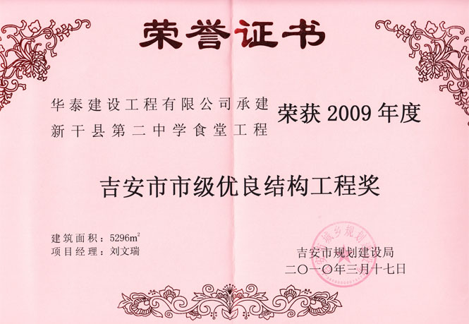 新干縣第二中學(xué)食堂工程榮獲2009年市級優(yōu)良結(jié)構(gòu)工程獎