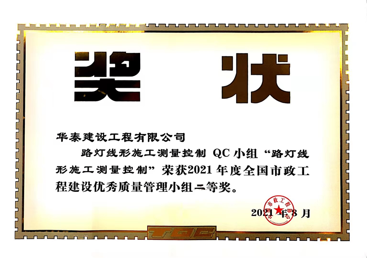 首頁(yè) > 關(guān)于華泰 > 企業(yè)榮譽(yù) > 榮獲2021年度全國(guó)市政工程建設(shè)優(yōu)秀質(zhì)量管理小組二等獎(jiǎng)