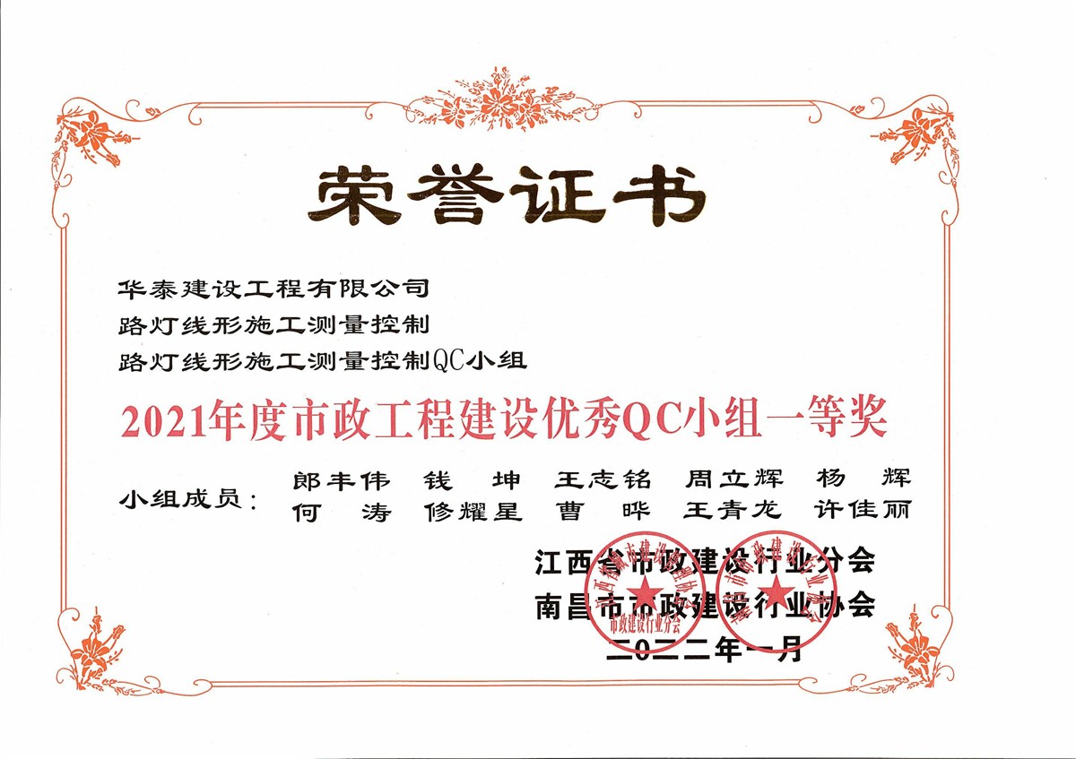首頁(yè) > 關(guān)于華泰 > 企業(yè)榮譽(yù) > 榮獲2021年度江西省市政工程建設(shè)優(yōu)秀QC小組一等獎(jiǎng) (路燈線形施工測(cè)量控制)