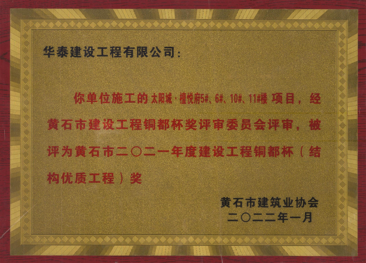 榮獲黃石市2021年度建設(shè)工程銅都杯(結(jié)構(gòu)優(yōu)質(zhì)工程)獎